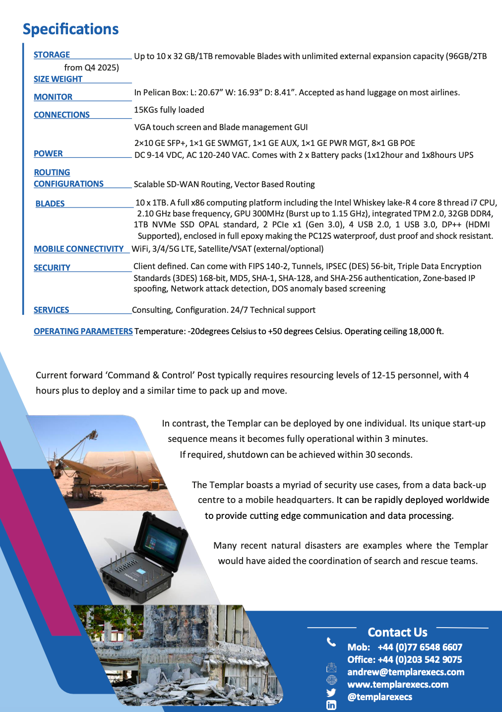 • Setting up a traditional ICT Data Centre typically takes hours and involves multiple trained specialists. At just 15 kilograms, the Templar can be activated by a single individual and carried by hand or by car with minimal training, establishing multiple nets within 3 minutes.