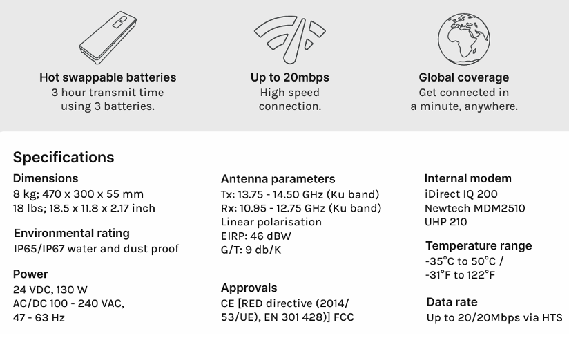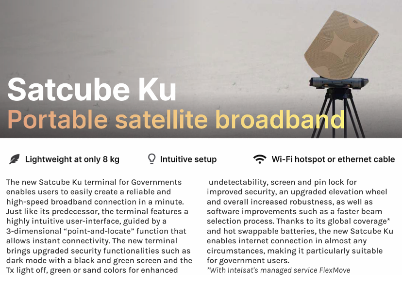 The new terminal brings upgraded security functionalities such as dark mode with a black and green screen and the Tx light off, green or sand colors for enhanced undetectability, screen and pin lock for improved security, an upgraded elevation wheel and overall increased robustness, as well as software improvements such as a faster beam selection process. Thanks to its global coverage* and hot swappable batteries, the new Satcube Ku enables internet connection in almost any circumstances, making it particularly suitable for government users.